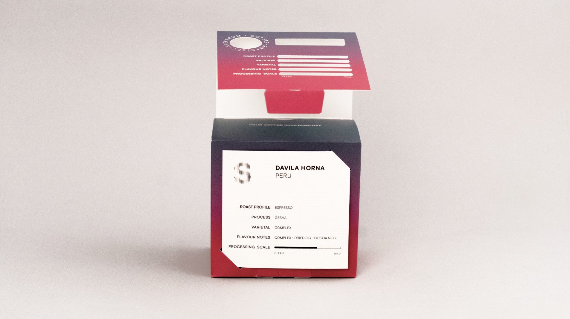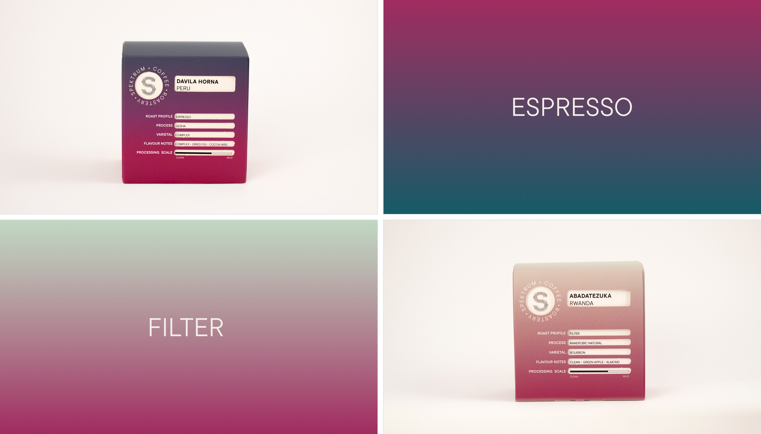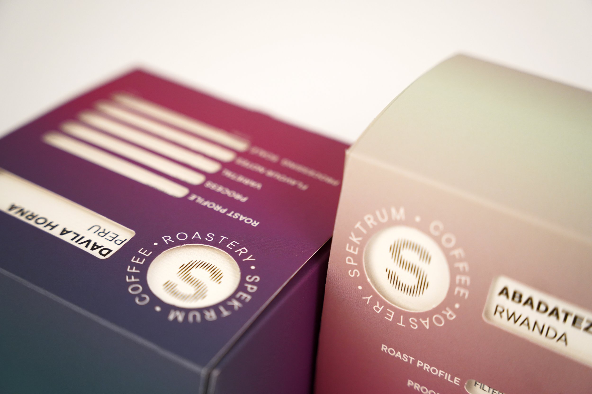 A márkanévből és a Spektrum ambícióiból inspirációt merítve a dobozok is a színképet jelenítik meg, két változatban, így kaptak könnyen megkülönböztethető csomagolást az espresso és a filterkávék.